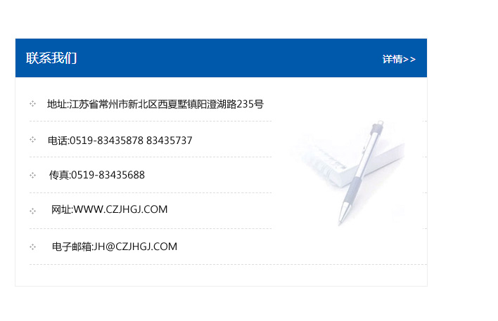 地址:常州市新北區友邦商務大廈1幢16、17層  電話:0519-85101652  傳真:0519-85112595  郵編:213022  網址:www_cz-jiayue_cn.eq1092.com  郵箱:xiajifengaa@163.com
